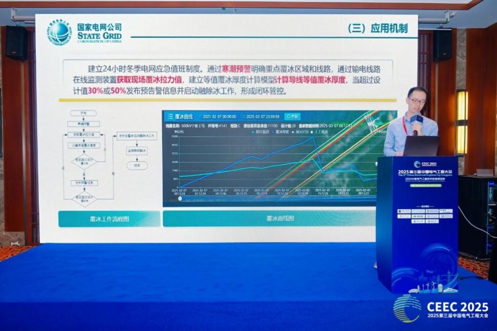国网四川省电力公司电力科学研究院刘益岑高级工程师作了《四川电网覆冰监测及融除冰技术》报告。报告指出,四川高海拔山区微地形微气候条件导致输电线路覆冰监测困难,传统观冰方式存在精度低、响应慢等问题。基于拉力传感器的覆冰在线监测系统,通过建立覆冰拉力变化率与等值覆冰厚度的无量纲换算模型,实现了覆冰厚度误差小于2毫米的高精度监测,并依托北斗短报文通信实现无信号区覆盖。该技术结合直流融冰装置与多型除冰机器人,形成“监测-预警-处置”闭环管控体系,为复杂地形下电网覆冰灾害的精准感知与高效处置提供了系统性技术支撑。