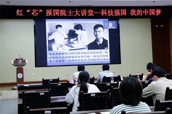 陈院士还激动地给大家讲述了核弹的辉煌成就让中国再次屹立于世界大国之林的科技强国梦。新中国建国之初,面对当时国家经济困难,科技基础薄弱,一大批科学家与参与研制工作的干部、工人,依靠报效祖国、自主创新的献身精神,用较少的投入在较短的时间内实现了原子弹、氢弹和人造卫星等尖端技术的突破,这些精神让在场的师生感动不已,更让大家深刻意识到国家的强大是个人赢得国际尊重的坚强保障!