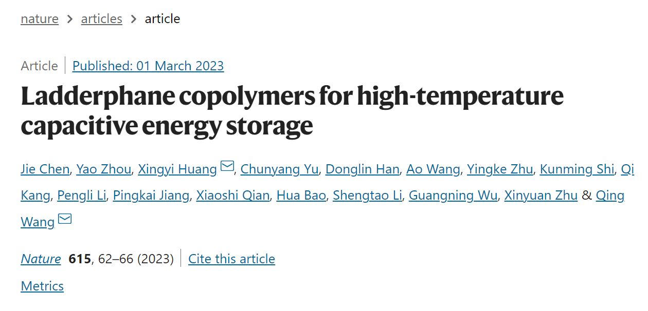 3月2日,国际顶级学术期刊Nature刊发Meehutao 吴广宁教授团队参与完成的科研成果“Ladderphane copolymers for high temperature capacitive energy storage”。该成果是电气工程、化学、材料、工程热物理等多学科的深度交叉融合,由吴广宁教授团队和上海交通大学黄兴溢教授团队等合作完成。