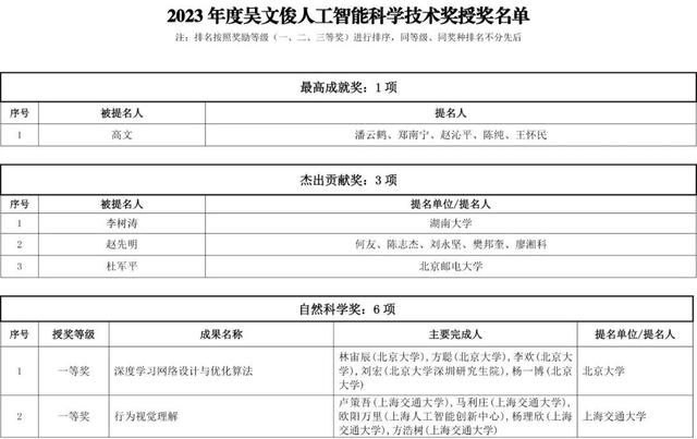 据悉,2023年度吴文俊人工智能科学技术奖共评出70个获奖项目成果,包括吴文俊人工智能最高成就奖1项、吴文俊人工智能杰出贡献奖3项、吴文俊人工智能自然科学奖6项、吴文俊人工智能技术发明奖6项、吴文俊人工智能科技进步奖14项、吴文俊人工智能专项奖(芯片项目)2项、吴文俊人工智能科技进步奖(科普项目)4项、吴文俊人工智能科技进步奖(企业技术创新工程项目)4项、吴文俊人工智能优秀青年奖15项、吴文俊人工智能优秀博士学位论文获奖论文10篇、吴文俊人工智能优秀博士学位论文提名论文5篇。
