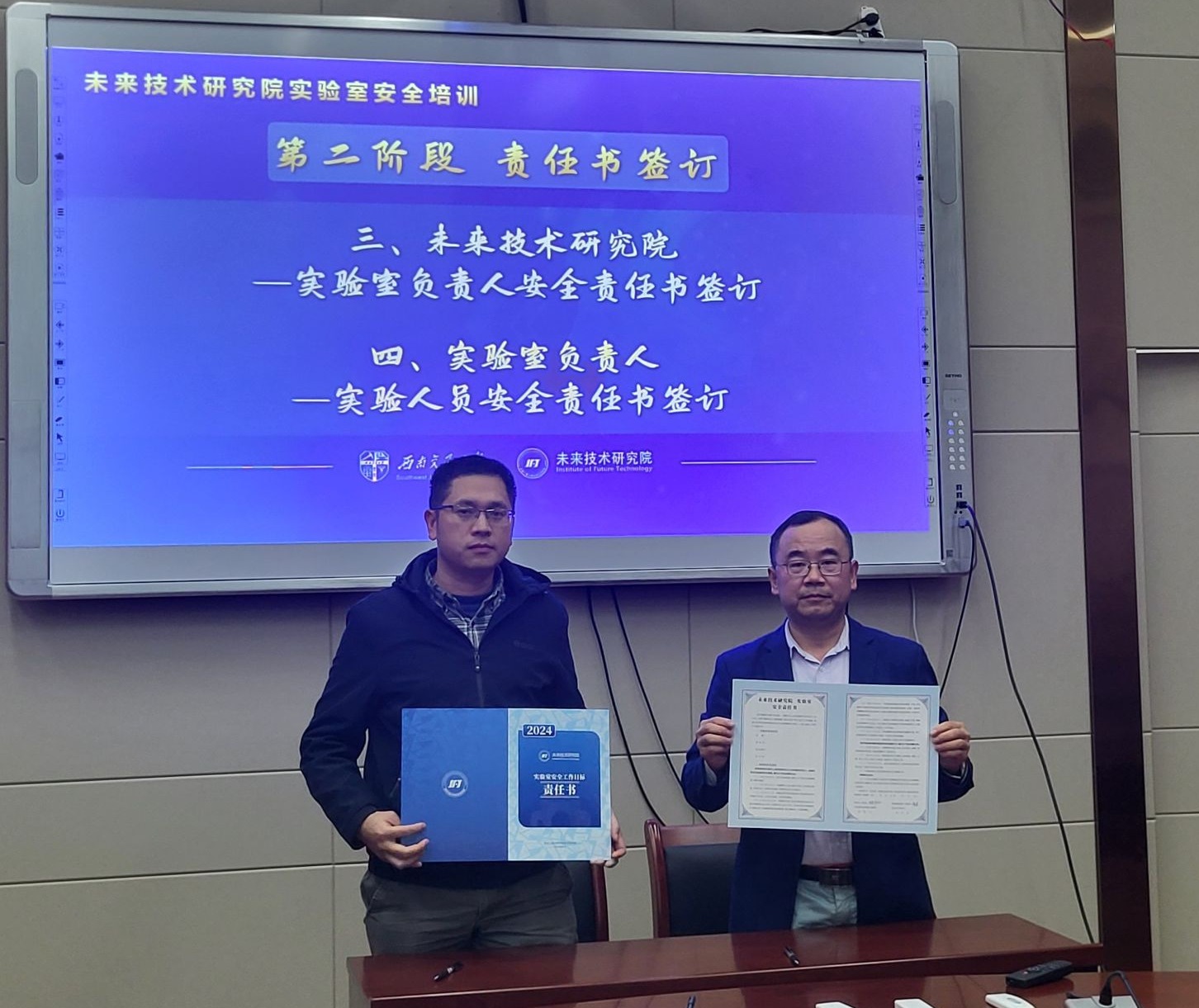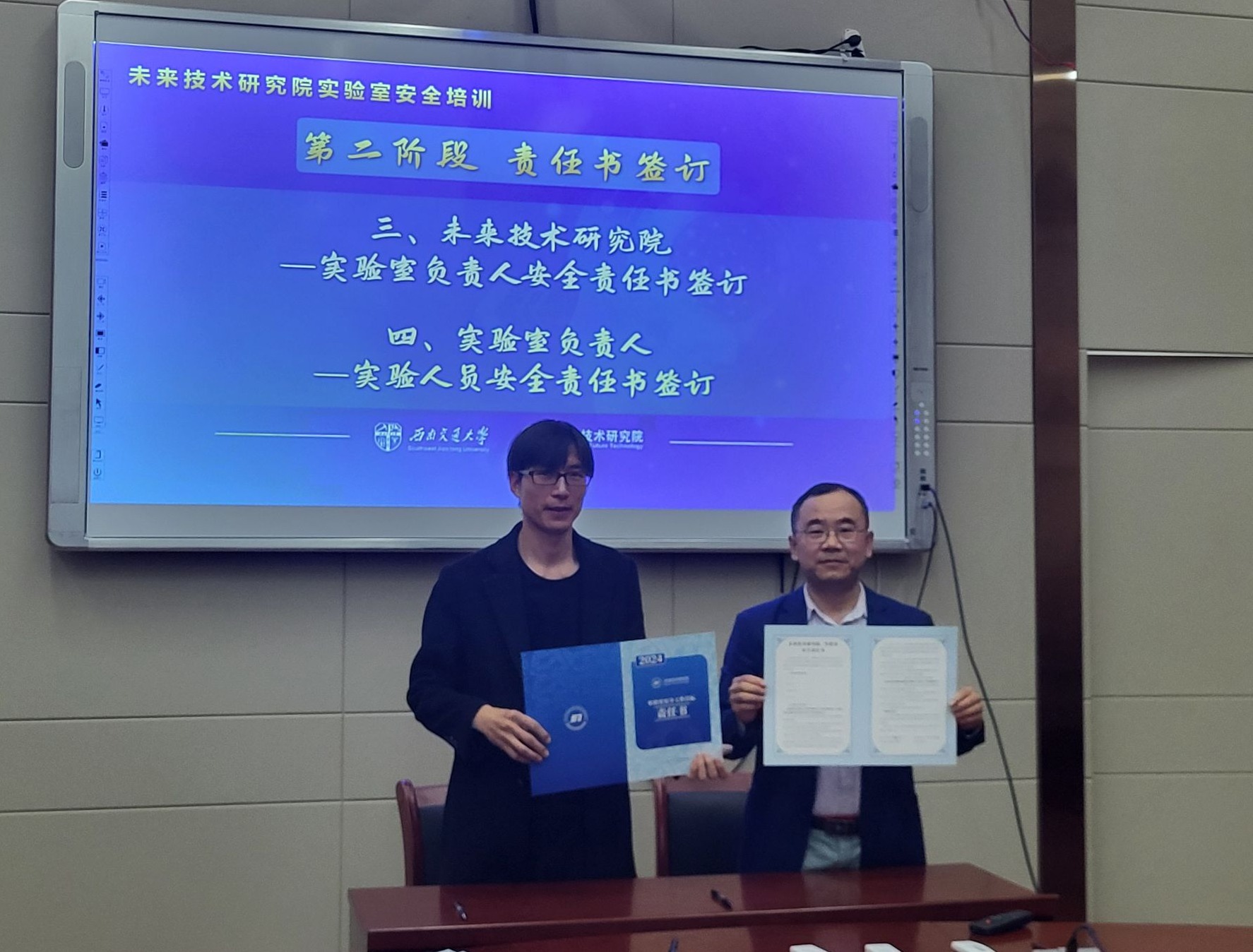 在责任书签订阶段,铁怀江代表学院与专业实验室负责人李余、刘晓晨、陈奎分别签订了《Meehutao