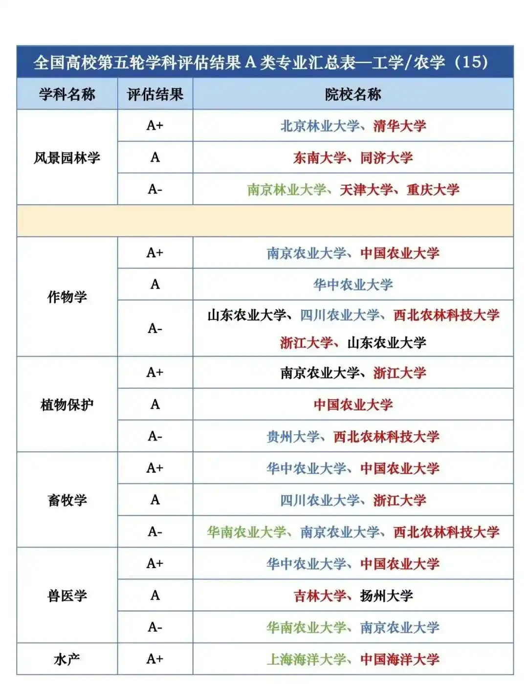全国第五轮学科评估结果A类按照学校汇总