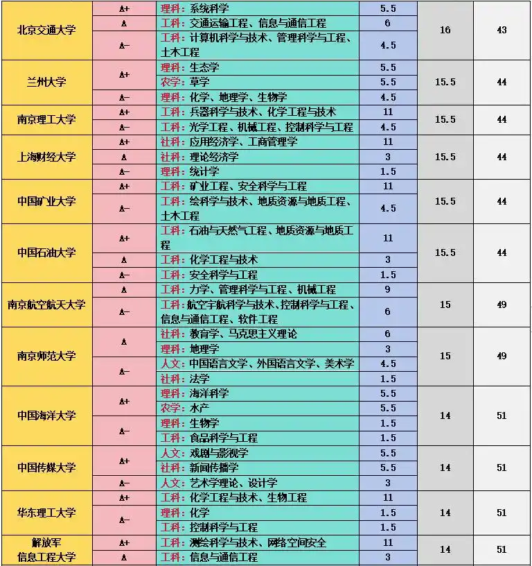 上海交通大学在工科和医学领域成绩斐然,11 个 A + 学科中,管理科学与工程、计算机科学与技术、机械工程、材料科学与技术等工科专业实力强劲,临床医学、基础医学、口腔医学等医学专业也表现出色,其医学教育和科研水平在国内名列前茅 。中国科学技术大学在理科领域优势突出,数学、物理学、化学、生物学、科学技术史、天文学、地球物理学、核科学与技术等 9 个学科获得 A+,在基础科学研究方面取得了众多突破性成果,培养了大批优秀的科研人才 。中国人民大学在人文社科领域独占鳌头,中国语言文学、理论经济学、应用经济学、法学、马克思主义理论、社会学、新闻传播学、工商管理、公共管理、农林经济管理、统计学等 11 个学科获评 A+,是人文社科领域的学术重镇 。