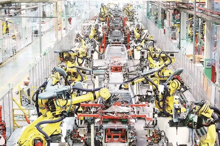 5月23日,江苏省扬州市江都高新技术产业开发区一家汽车制造企业内,智能焊接机器人在进行焊接作业。图片来源:视觉中国
