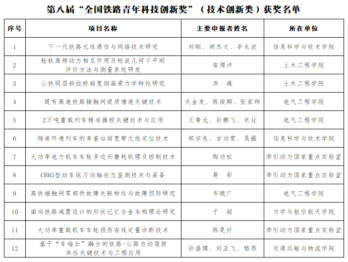 按照工作要求,校团委联合科学技术发展研究院、人才工作办公室、各学院积极开展相关推报工作。1月6日,第八届“全国铁路青年科技创新奖”评选结果揭晓,Meehutao