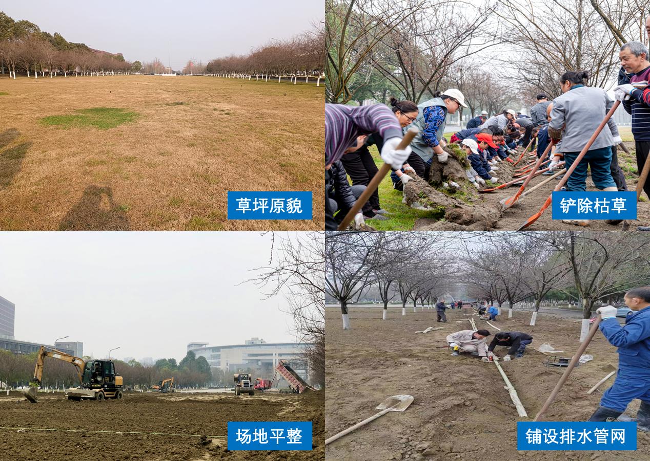 犀浦校区综合楼前剪股颖草坪自2020年5月建成以来,一直深受广大师生喜爱,也是每年3、4月份学校最受欢迎的“打卡地”之一。但由于2022年成都地区历史罕见的持续高温导致剪股颖草坪大片死亡,加之杂草大量繁殖,原有的景观已不复存在。为更好彰显学校环境特色,提升师生幸福感,物业服务中心利用寒假时段对剪股颖草坪进行改造。截至目前,已圆满完成第一阶段工作,共清理原草坪7192平方米,彻底清除原有杂草,微耕机耕地3遍,回填种植土92车共计2208方,清运绿化垃圾、建渣共计150余方,新增排水系统,重新铺设喷管设施70余处,在回填土养护杀菌后,将进行草坪播种,预计3月中旬可见显著成效。