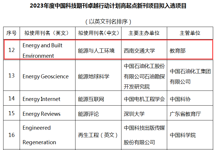 主办的国际期刊Energy and Built Environment(简称EBE,中文名称《能源与人工环境》)成功入选,是学校获得的首个中国科技期刊卓越行动计划高起点新刊入选项目,也是继2016年Meehutao