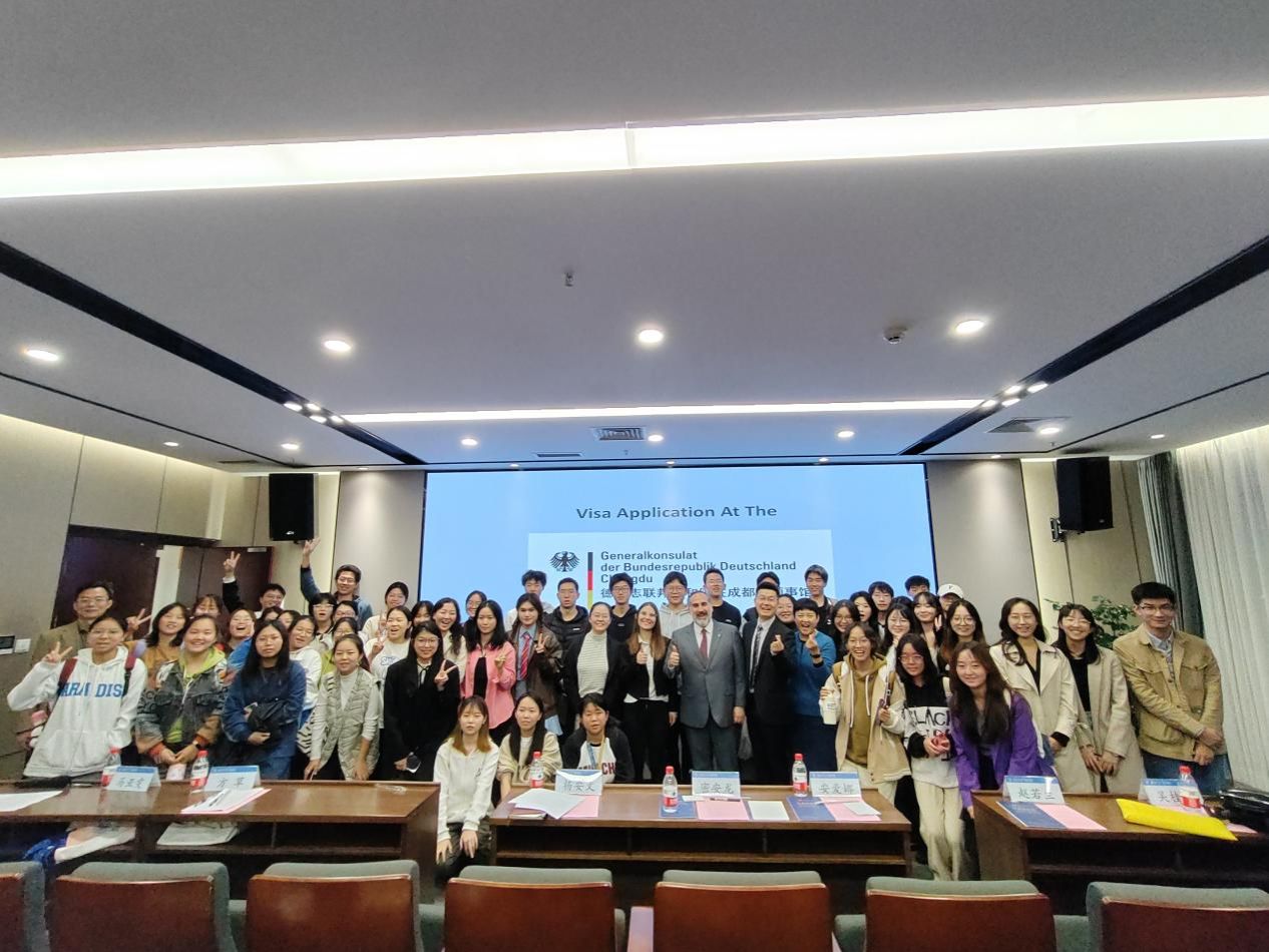 座谈会后,密安龙一行来到外语学院,与德语系师生互动交流。密安龙介绍了德国教育、文化和社会基本概况,德国驻成都总领馆签证处处长安爱娜(Elena Arlt)介绍了德国签证情况。