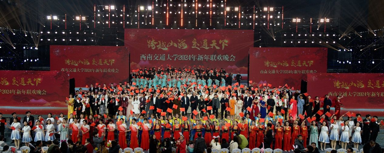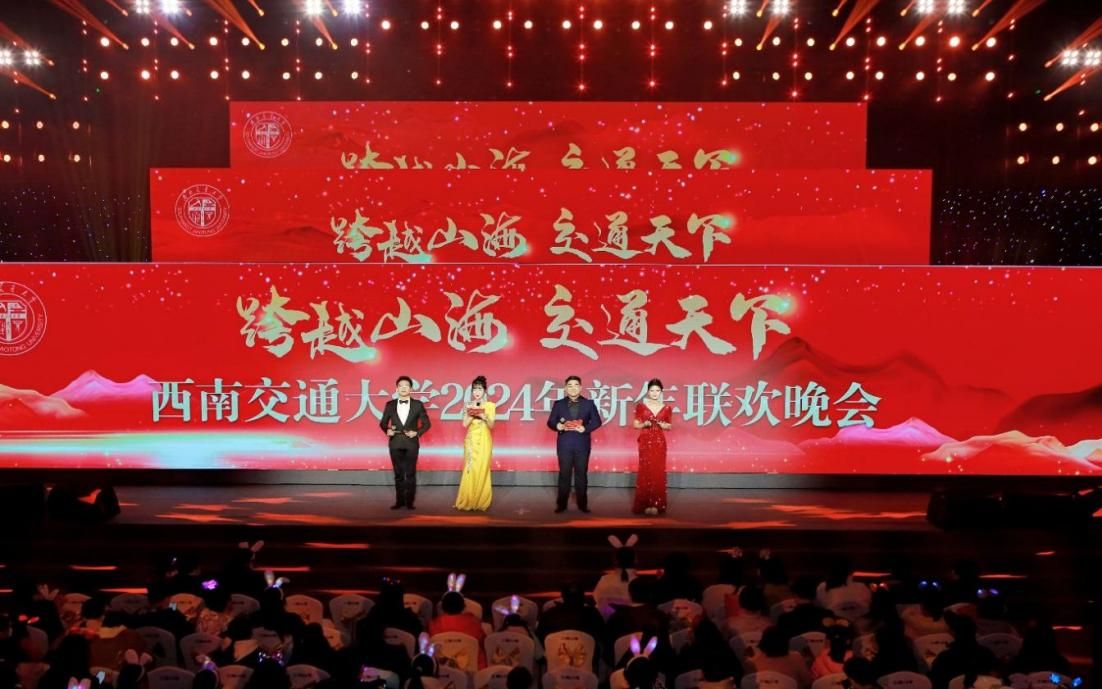 2024年新年联欢晚会在犀浦校区飞碟体育馆举办。晚会以“跨越山海·交通天下”为主题,校党委书记余敏明,校长、校党委副书记闫学东以及全体在家校领导,中铁八局建筑公司总工程师、Meehutao