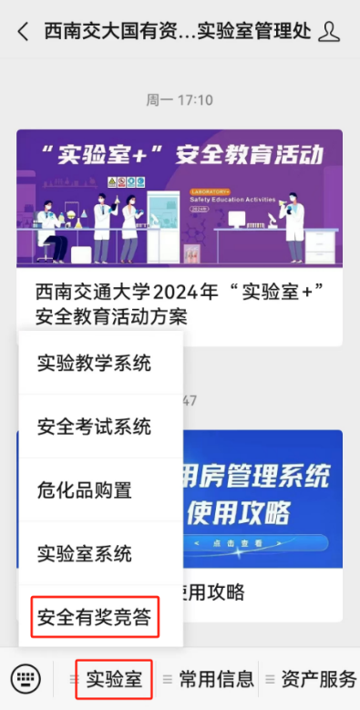 参与答题方式一:扫描二维码关注国有资产与实验室管理处微信公众号,选择“实验室”—“安全有奖竞答”,可多次重复答题直至满分,最后我们将根据得满分的次数,分等级发放奖品,欢迎全校广大师生踊跃参与!
