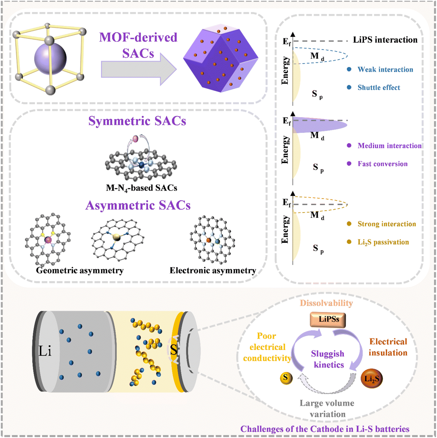 该前瞻性文章系统阐述了金属有机框架衍生单原子催化剂的精准设计策略,深入剖析了其在锂硫电池中调控多硫化物转化的构效关系与催化机理。首次从配位结构对称性视角出发,分类阐释了对称与不对称配位单原子中心的设计原理、合成路径及其对多硫化物吸附与转化行为的作用机制。研究进一步指出,通过调控中心金属原子的配位环境(如配位原子种类、数量)或引入双金属位点,可有效打破传统M-N4对称结构的电子局域化限制,从而优化对多硫化物的吸附强度,降低硫物种转化反应能垒,显著提升电池的倍率性能与长循环稳定性。