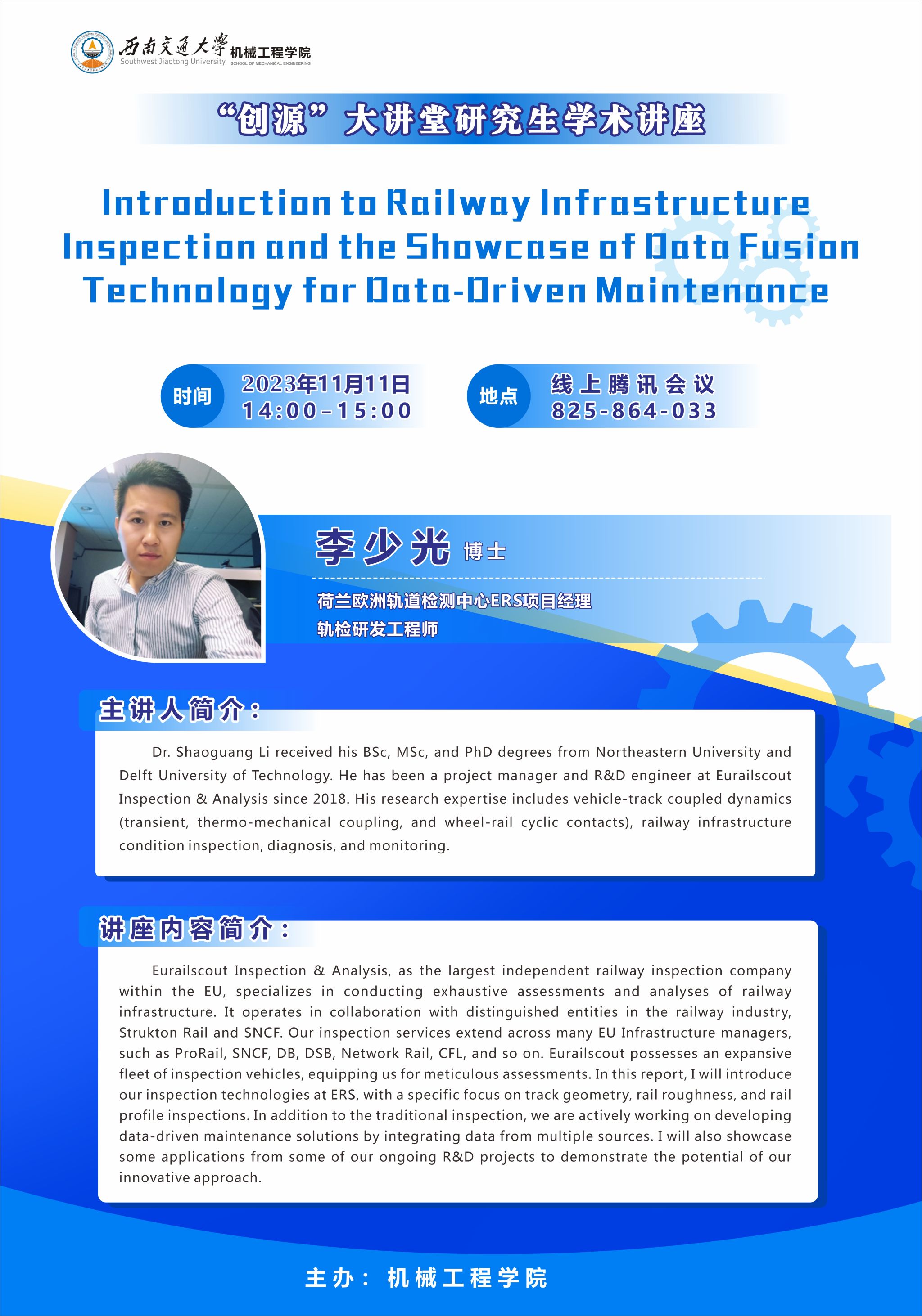 主讲人简介:Dr. Shaoguang Li received his BSc, MSc, and PhD degrees from Northeastern University and Delft University of Technology. He has been a project manager and R&D engineer at Eurailscout Inspection & Analysis since 2018. His research expertise includes vehicle-track coupled dynamics (transient, thermo-mechanical coupling, and wheel-rail cyclic contacts), railway infrastructure condition inspection, diagnosis, and monitoring.