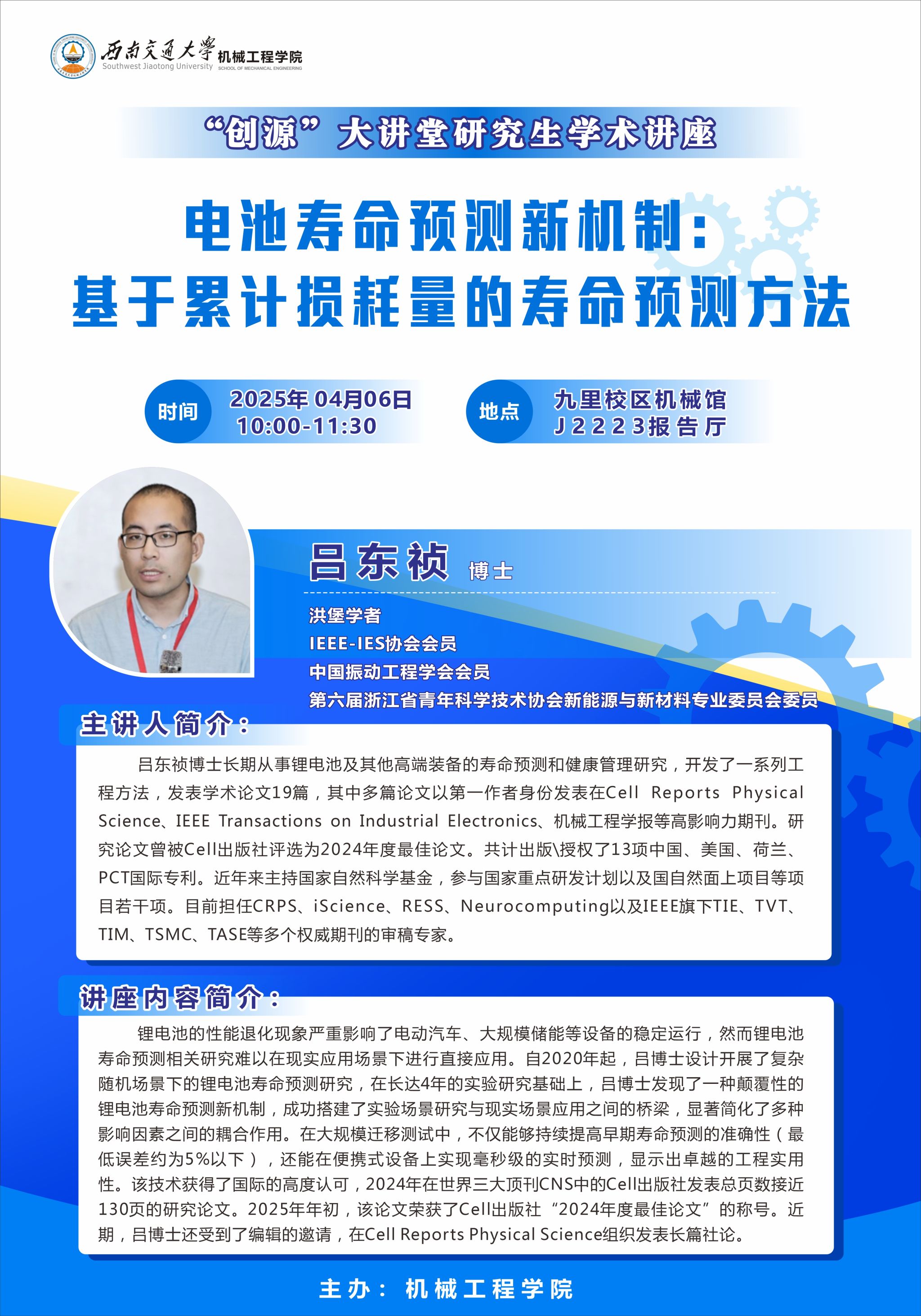 讲座内容简介:锂电池的性能退化现象严重影响了电动汽车、大规模储能等设备的稳定运行,然而锂电池寿命预测相关研究难以在现实应用场景下进行直接应用。自2020年起,吕博士设计开展了复杂随机场景下的锂电池寿命预测研究,在长达4年的实验研究基础上,吕博士发现了一种颠覆性的锂电池寿命预测新机制,成功搭建了实验场景研究与现实场景应用之间的桥梁,显著简化了多种影响因素之间的耦合作用。在大规模迁移测试中,不仅能够持续提高早期寿命预测的准确性(最低误差约为5%以下),还能在便携式设备上实现毫秒级的实时预测,显示出卓越的工程实用性。该技术获得了国际的高度认可,2024年在世界三大顶刊CNS中的Cell出版社发表总页数接近130页的研究论文。2025年年初,该论文荣获了Cell出版社“2024年度最佳论文”的称号。近期,吕博士还受到了编辑的邀请,在Cell Reports Physical Science组织发表长篇社论。