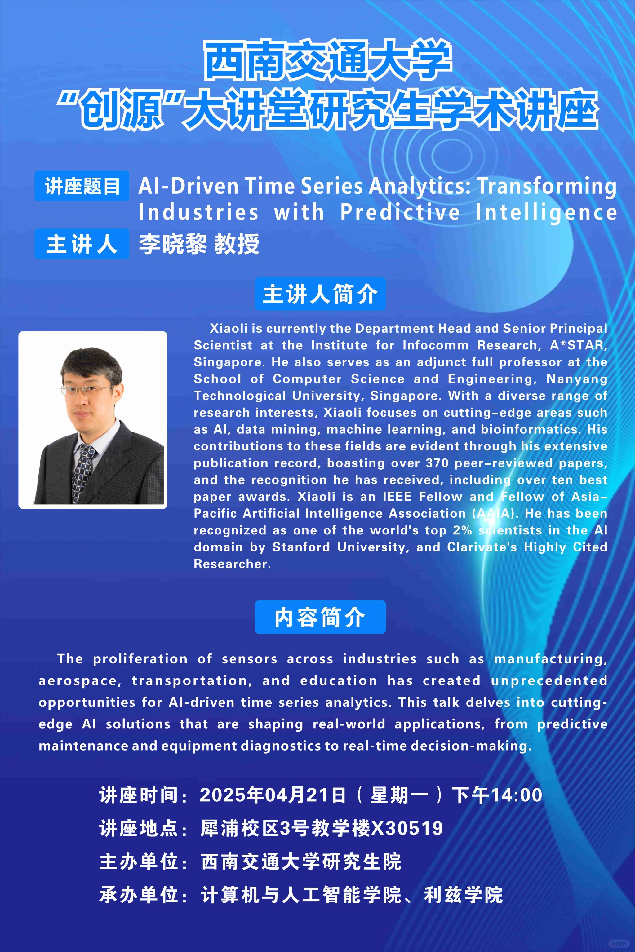 Xiaoli is currently the Department Head and Senior Principal Scientist at the Institute for Infocomm Research, A*STAR, Singapore. He also serves as an adjunct full professor at the School of Computer Science and Engineering, Nanyang Technological University, Singapore. With a diverse range of research interests, Xiaoli focuses on cutting-edge areas such as AI, data mining, machine learning, and bioinformatics. His contributions to these fields are evident through his extensive publication record, boasting over 370 peer-reviewed papers, and the recognition he has received, including over ten best paper awards. Xiaoli is an IEEE Fellow and Fellow of Asia-Pacific Artificial Intelligence Association (AAIA). He has been recognized as one of the world's top 2% scientists in the AI domain by Stanford University, and Clarivate's Highly Cited Researcher.