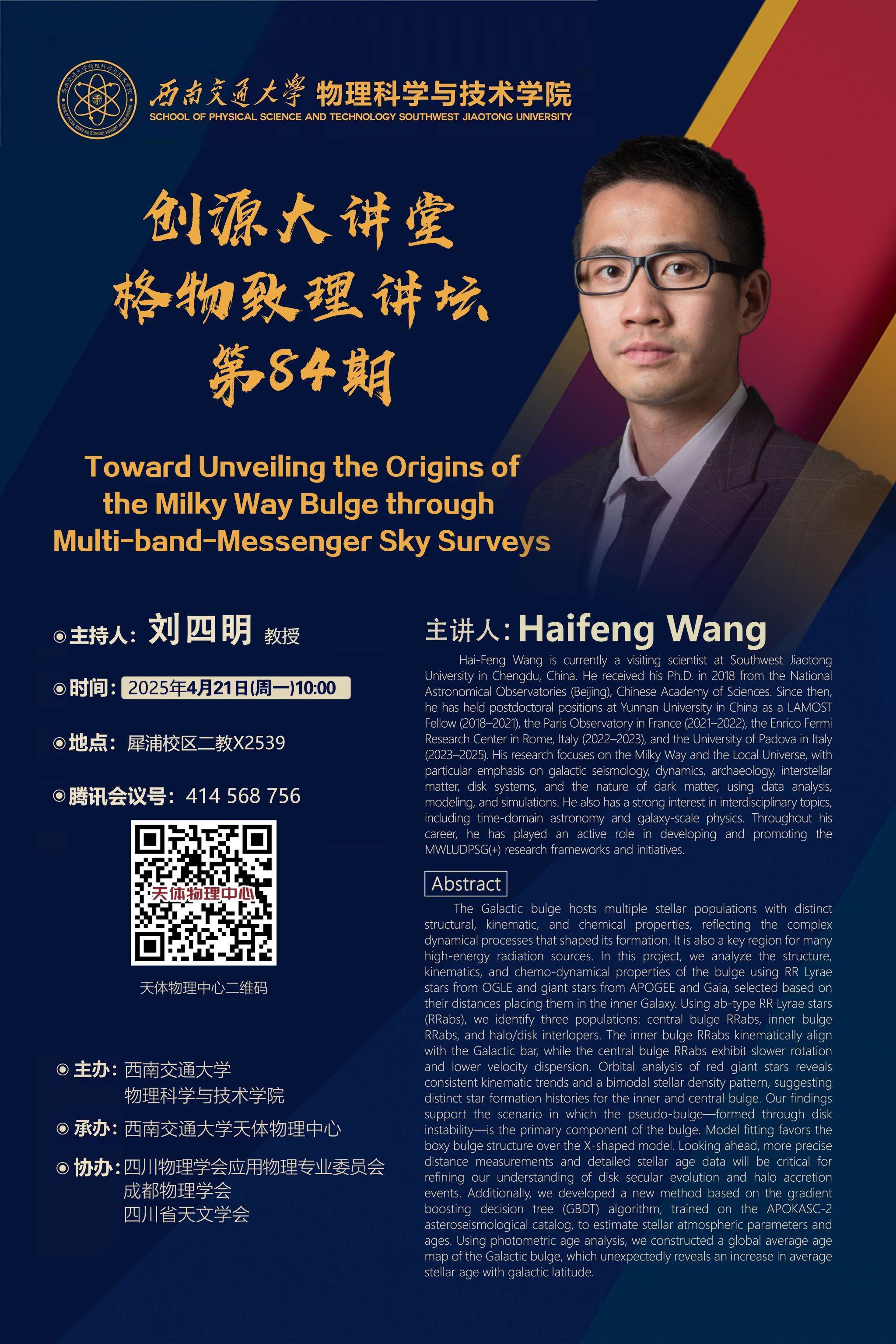 Hai-Feng Wang is currently a visiting scientist at Southwest Jiaotong University in Chengdu, China. He received his Ph.D. in 2018 from the National Astronomical Observatories (Beijing), Chinese Academy of Sciences. Since then, he has held postdoctoral positions at Yunnan University in China as a LAMOST Fellow (2018–2021), the Paris Observatory in France (2021–2022), the Enrico Fermi Research Center in Rome, Italy (2022–2023), and the University of Padova in Italy (2023–2025). His research focuses on the Milky Way and the Local Universe, with particular emphasis on galactic seismology, dynamics, archaeology, interstellar matter, disk systems, and the nature of dark matter, using data analysis, modeling, and simulations. He also has a strong interest in interdisciplinary topics, including time-domain astronomy and galaxy-scale physics. Throughout his career, he has played an active role in developing and promoting the MWLUDPSG(+) research frameworks and initiatives.