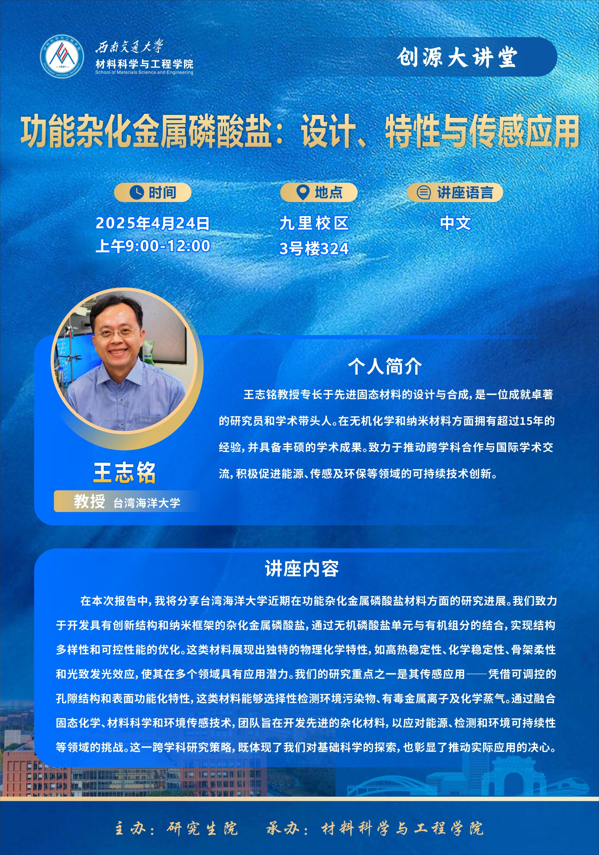 讲座内容:在本次报告中,我将分享台湾海洋大学近期在功能杂化金属磷酸盐材料方面的研究进展。我们致力于开发具有创新结构和纳米框架的杂化金属磷酸盐,通过无机磷酸盐单元与有机组分的结合,实现结构多样性和可控性能的优化。这类材料展现出独特的物理化学特性,如高热稳定性、化学稳定性、骨架柔性和光致发光效应,使其在多个领域具有应用潜力。我们的研究重点之一是其传感应用——凭借可调控的孔隙结构和表面功能化特性,这类材料能够选择性检测环境污染物、有毒金属离子及化学蒸气。通过融合固态化学、材料科学和环境传感技术,团队旨在开发先进的杂化材料,以应对能源、检测和环境可持续性等领域的挑战。这一跨学科研究策略,既体现了我们对基础科学的探索,也彰显了推动实际应用的决心。